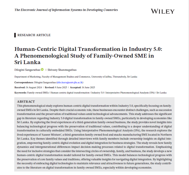 | Citation: | Sangarathas, D., & Shanmugathas, S. (2025). Human‐Centric Digital Transformation in Industry 5.0: A Phenomenological Study of Family‐Owned SME in Sri Lanka. The Electronic Journal of Information Systems in Developing Countries, 91(4), e70026. |